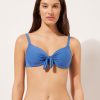 Unpadded balconette bikini top with underwire. The structure of the cups perfectly embraces and supports the bust, while the side drawstring can adjust the fit. Ideal for larger busts. The style features a crinkle fabric with a three-dimensional effect. Adjustable straps and thin tie closure on the back.