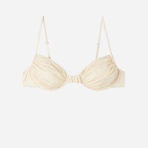 Unpadded balconette bikini top with underwire. The structure of the cups perfectly embrace and support the bust, thanks to the side drawstring on the cups that can also adjust the fit. Ideal for the larger bust. The style features a bright fabric with a silky effect, embellished by ruffles and gold tips. Adjustable straps and hook closure with two adjusters.