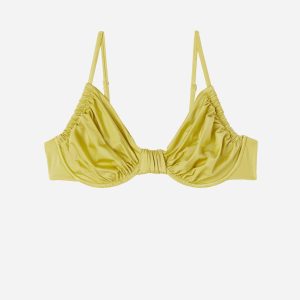 Unpadded balconette bikini top with underwire. The structure of the cups perfectly embrace and support the bust, thanks to the side drawstring on the cups that can also adjust the fit. Ideal for the larger bust. The style features a bright fabric with a silky effect, embellished by ruffles and gold tips. Adjustable straps and hook closure with two adjusters.