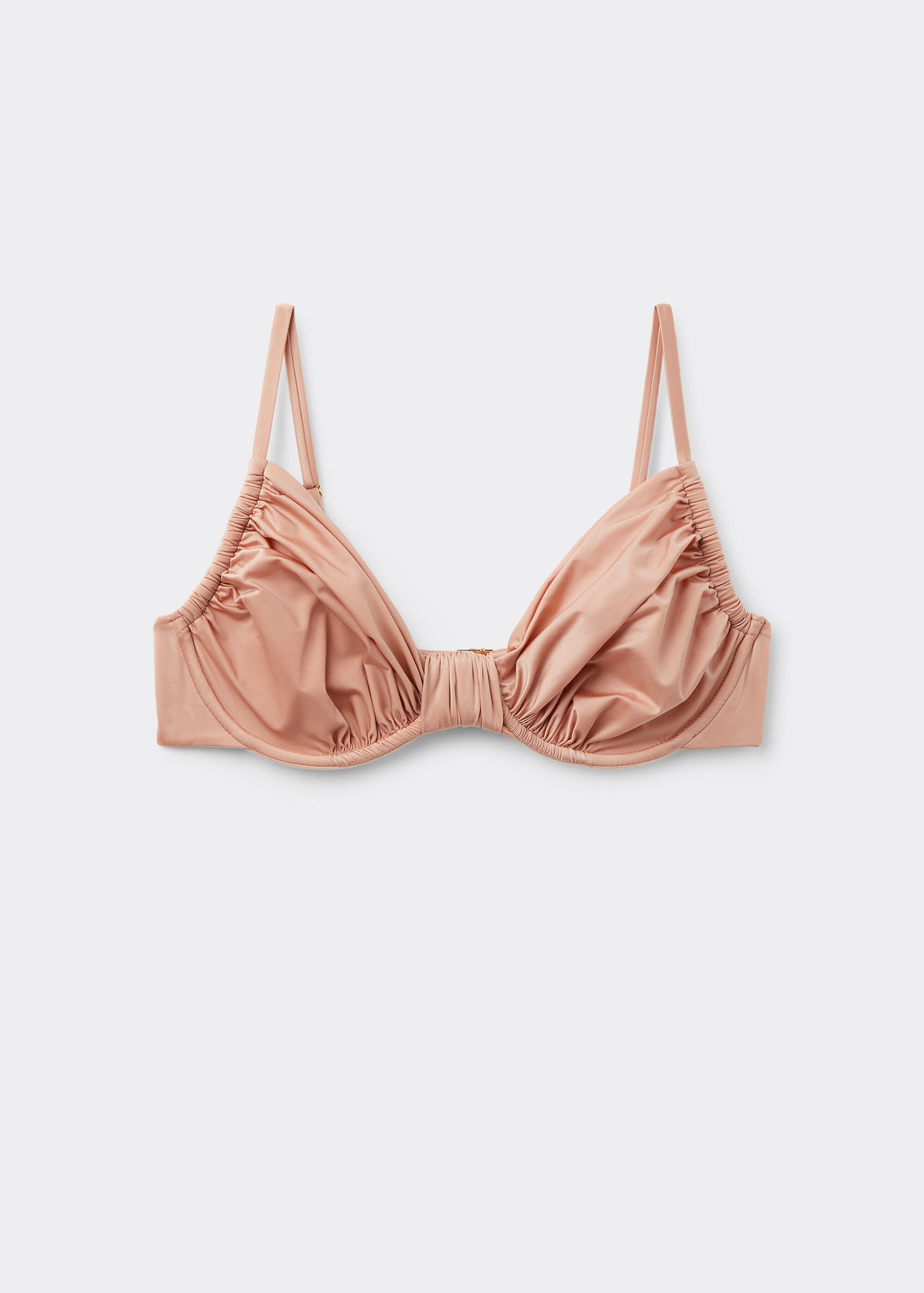 Unpadded balconette bikini top with underwire. The structure of the cups perfectly embrace and support the bust, thanks to the side drawstring on the cups that can also adjust the fit. Ideal for the larger bust. The style features a bright fabric with a silky effect, embellished by ruffles and gold tips. Adjustable straps and hook closure with two adjusters.