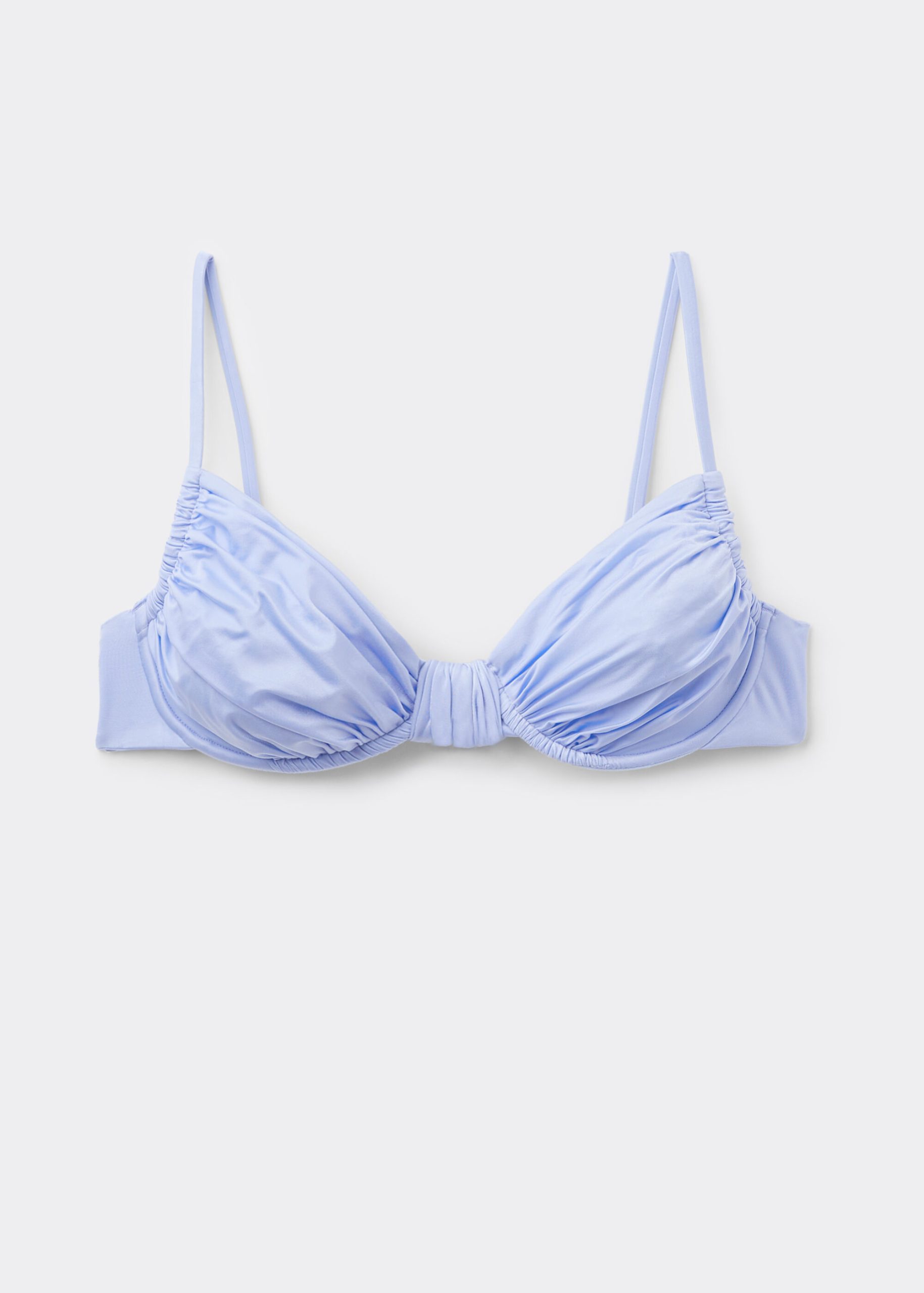 Unpadded balconette bikini top with underwire. The structure of the cups perfectly embrace and support the bust, thanks to the side drawstring on the cups that can also adjust the fit. Ideal for the larger bust. The style features a bright fabric with a silky effect, embellished by ruffles and gold tips. Adjustable straps and hook closure with two adjusters.