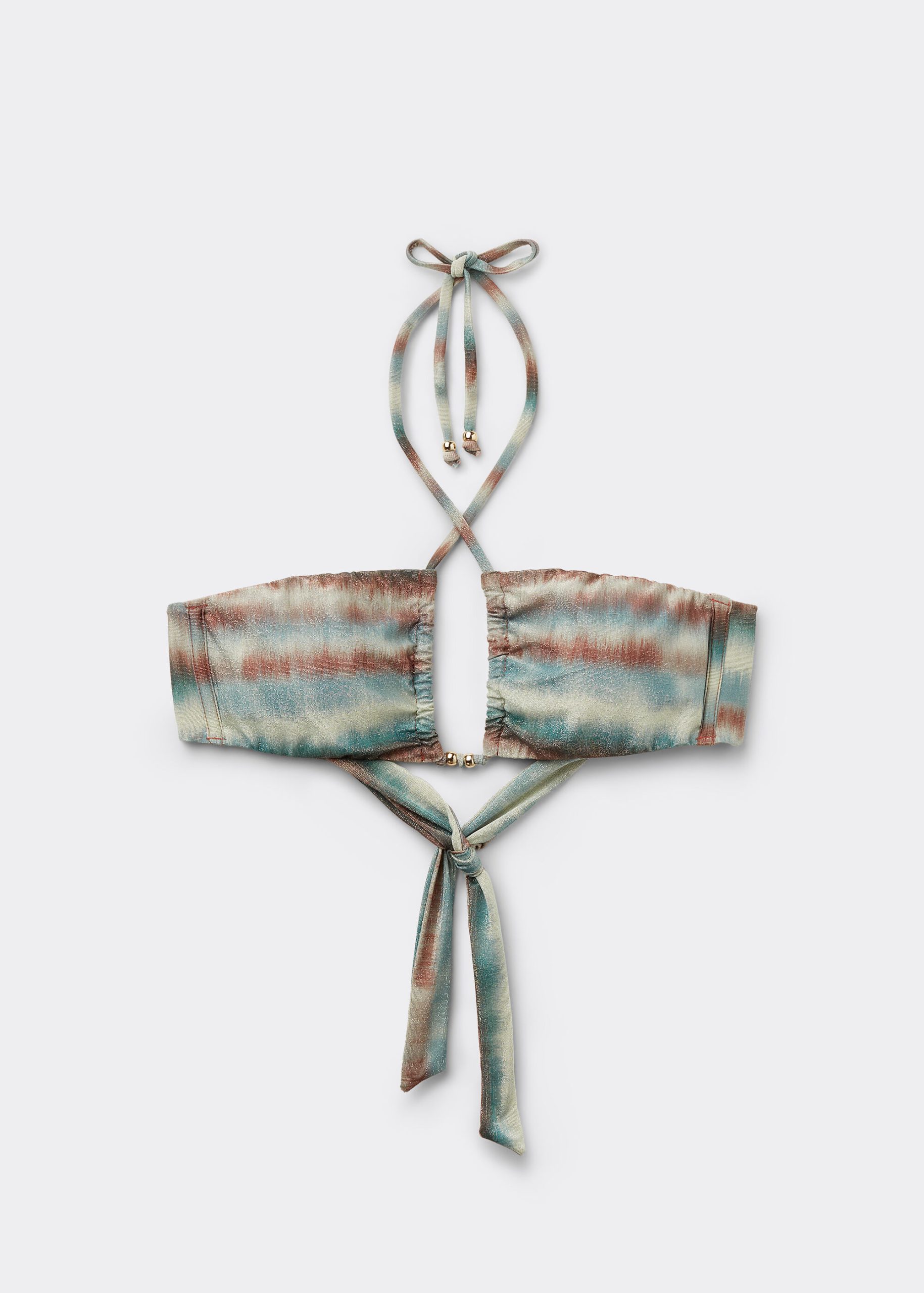 Bandeau bikini top with no padding or underwire boasting a versatile and minimalist design. The front crossing of strings, which can be tied in different ways, give a touch of originality and refinement. The string fastening on the back guarantees an adjustable fit, perfect for an absolutely personalized summer look.