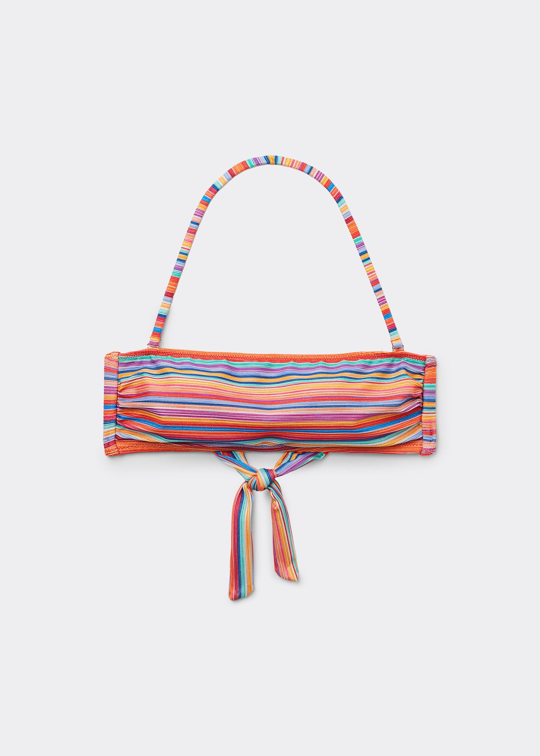 Lightly padded straight-cut bandeau bikini top, wireless for a natural effect. The side boning helps support the bust. Striped patterned fabric in bright colors enhanced with sparkling glitter, creating a dynamic and contemporary effect with its soft texture and vibrant look. Removable shoulder strap. Back tie closure.