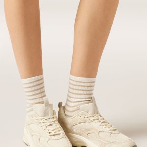 Women’s short socks in soft cotton. The micro-ribbing offers a refined touch and right amount of stretch. The romantic edge and contrasting color bands add a subtle and feminine originality.