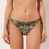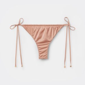 Brazilian cut bikini bottom with side ties to adjust the fit. The style features a bright fabric with a silky effect, embellished by ruffles and gold tips. Fully lined with invisible seams.