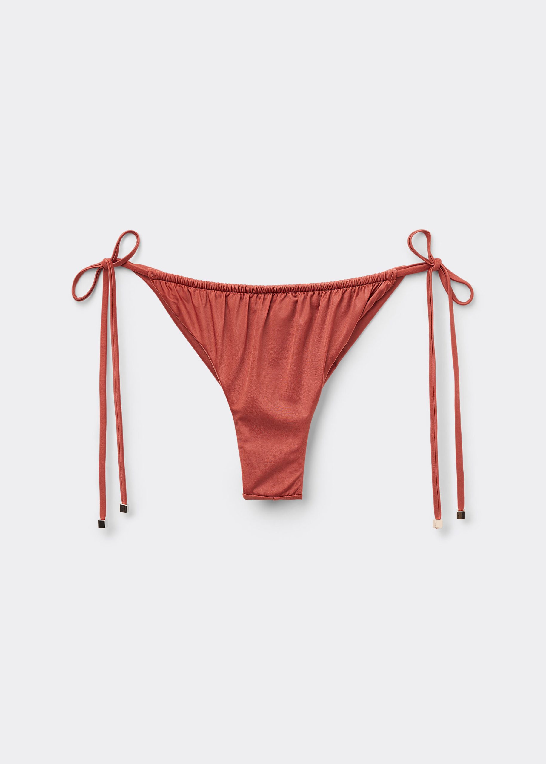 Brazilian cut bikini bottom with side ties to adjust the fit. The style features a bright fabric with a silky effect, embellished by ruffles and gold tips. Fully lined with invisible seams.