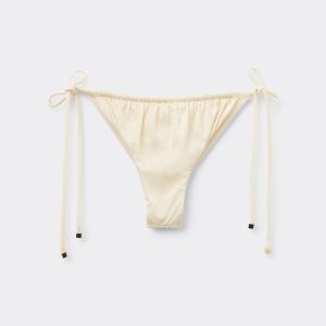 Brazilian cut bikini bottom with side ties to adjust the fit. The style features a bright fabric with a silky effect, embellished by ruffles and gold tips. Fully lined with invisible seams.