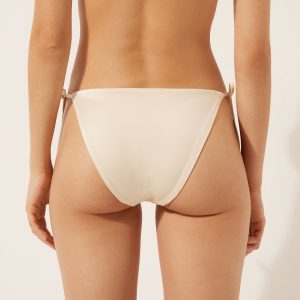 Brazilian cut bikini bottom with side ties to adjust the fit. The style features a bright fabric with a silky effect, embellished by ruffles and gold tips. Fully lined with invisible seams.