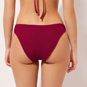 Brazilian cut bikini bottoms with side ties. The slightly rounded waist at the front allows for both a regular and more high-cut fit, depending on one’s physique. The 3D crinkled fabric, enriched by a braided string, provides a touch of sophisticated elegance. Fully lined with invisible seams.