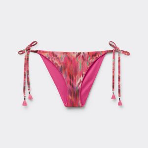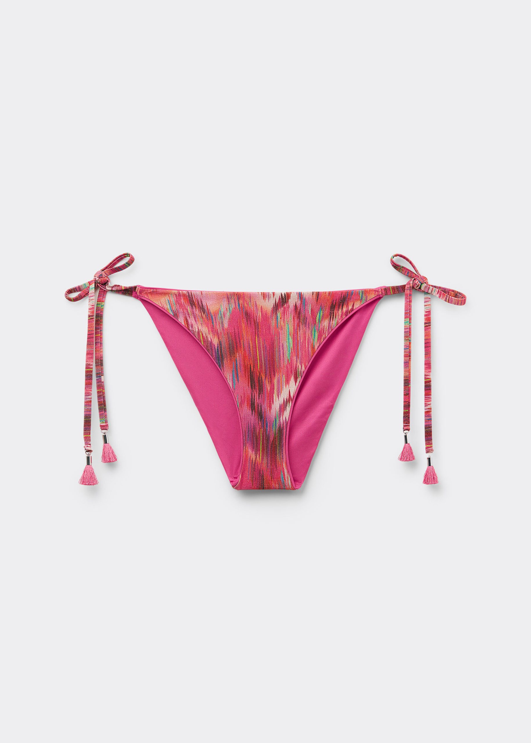 Brazilian cut bikini bottoms with side ties to adjust the fit. The rounded waist at the front allows for both a classic or more high-cut fit, depending on one’s physique. Pattern illuminated by sparkling glitter, with vibrant patterns in a mix of warm and bright tones. Reminiscent of a refined ethnic style. Fully lined. Back gathered seam for a better fit.