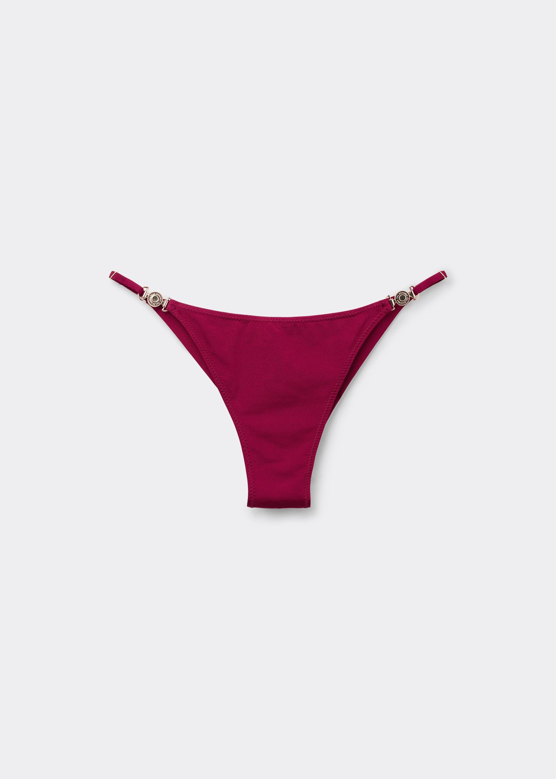 Brazilian bikini bottoms with adjustable side panels, featuring a minimal fit that exalts the silhouette with a touch of sensuality and refinement. The slightly rounded waist at the front allows for both a regular and more high-cut fit, depending on one’s physique. The bright silk-effect fabric embellished by elegant golden details radiates a sophisticated sensation of discrete luxury. Fully lined with invisible seams.
