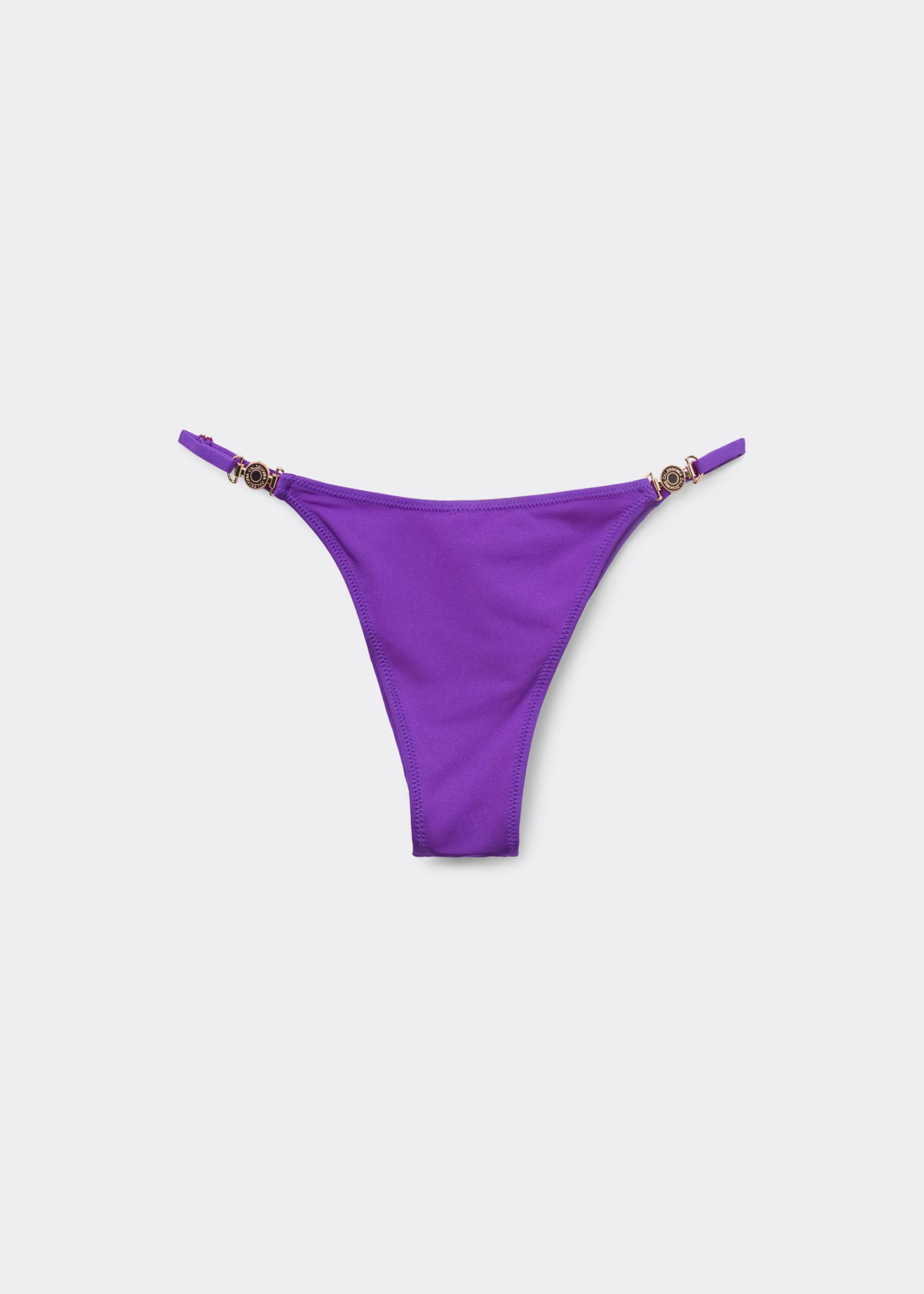 Brazilian bikini bottoms with adjustable side panels, featuring a minimal fit that exalts the silhouette with a touch of sensuality and refinement. The slightly rounded waist at the front allows for both a regular and more high-cut fit, depending on one’s physique. The bright silk-effect fabric embellished by elegant golden details radiates a sophisticated sensation of discrete luxury. Fully lined with invisible seams.