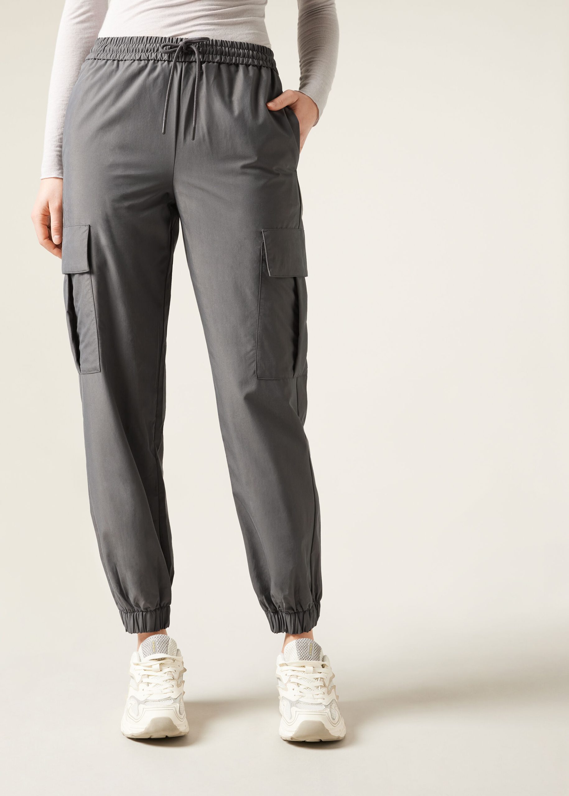 Cargo pants in soft touch modal, featuring convenient side pockets and cuffed hems for a modern fit. The elastic drawstring waist offers comfort and practicality, making them perfect for a casual and functional look.