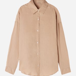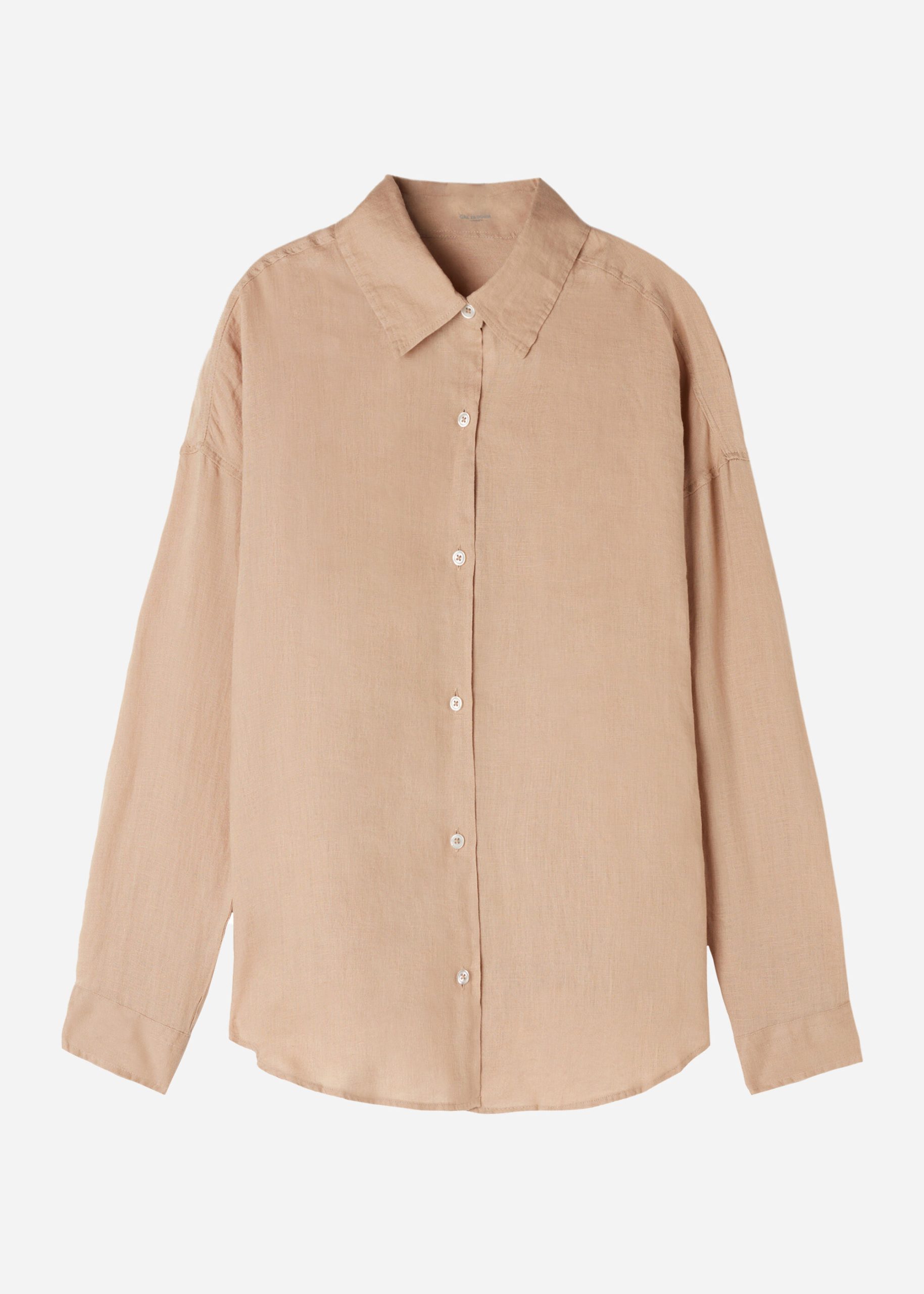 Cropped button-down shirt in linen, perfect for those who love natural fibers, with shirt collar and long sleeves.