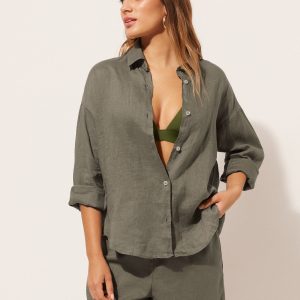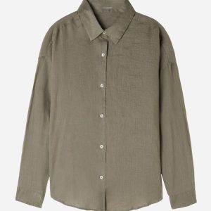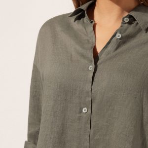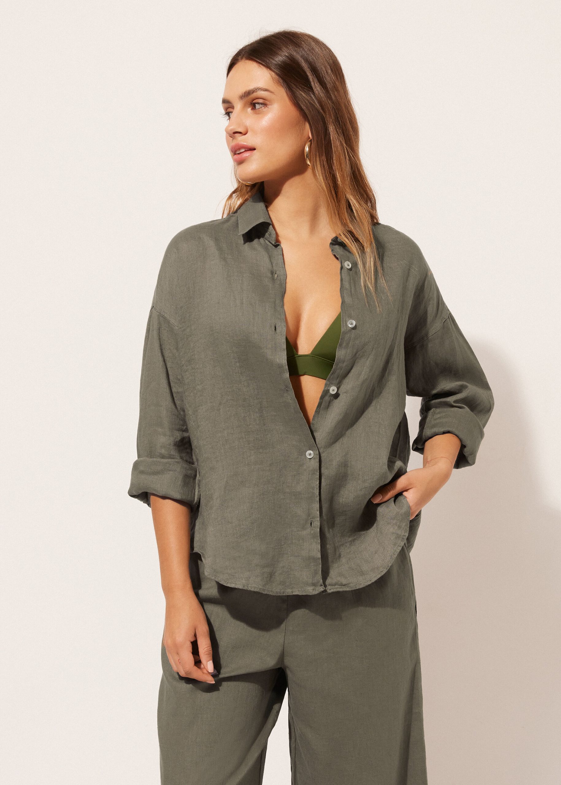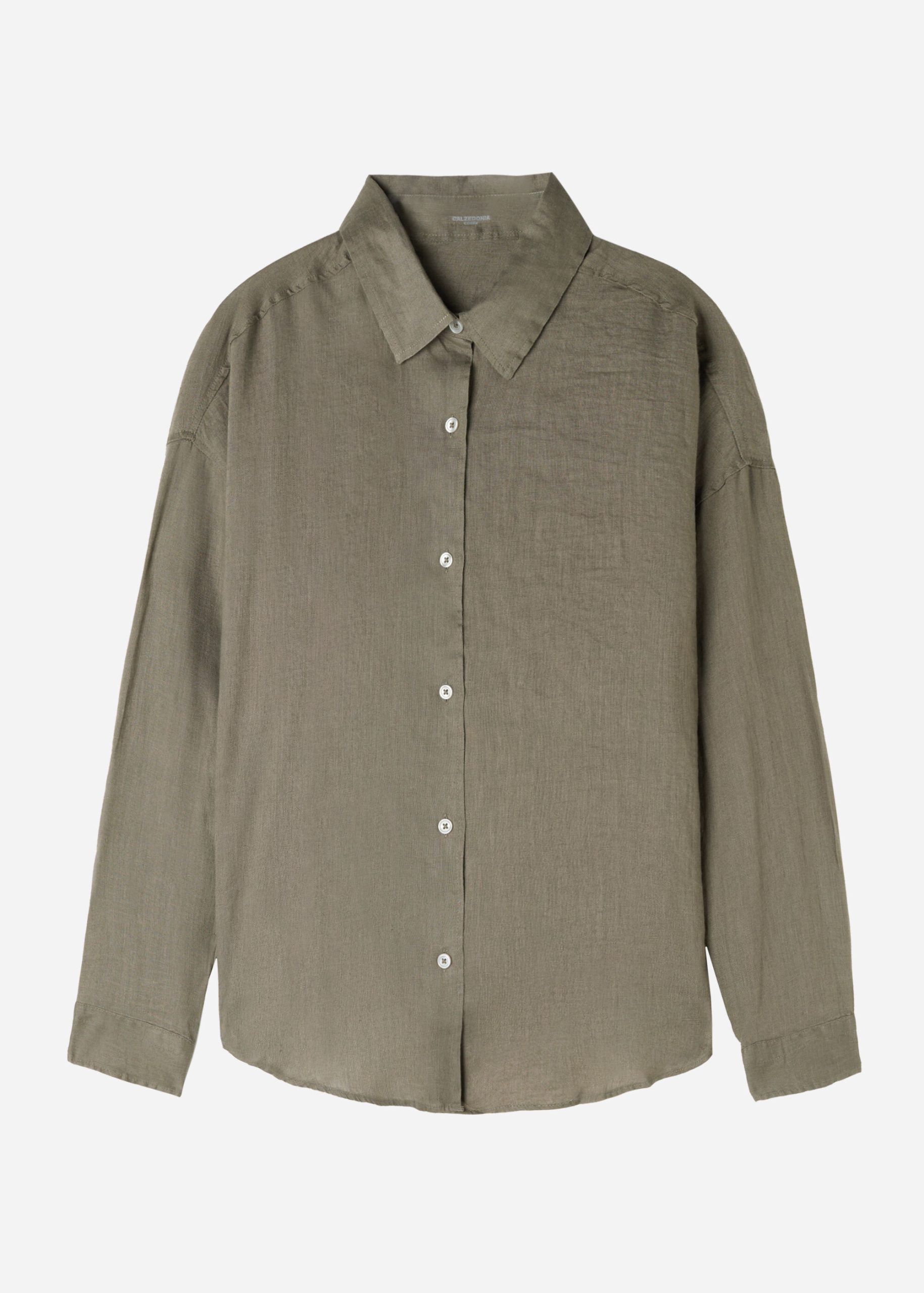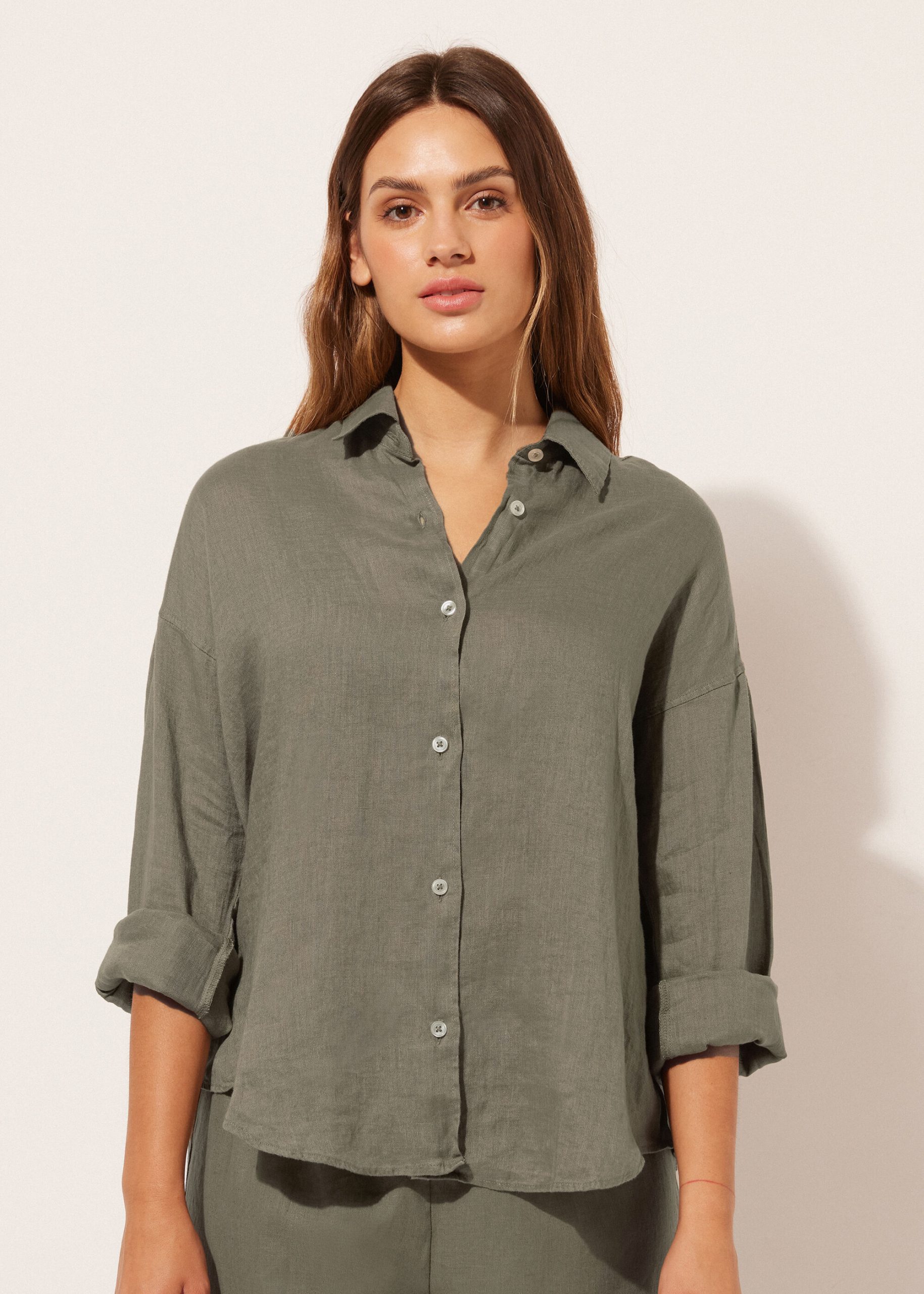 Cropped button-down shirt in linen, perfect for those who love natural fibers, with shirt collar and long sleeves.