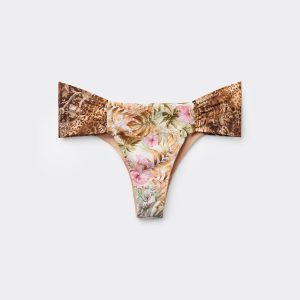 Brazilian bikini bottoms with draped fabric at the sides that allow the height to be adjusted. A vibrant pattern that combines tropical floral prints and delicate colors with animal print details. Fully lined and with invisible seams.