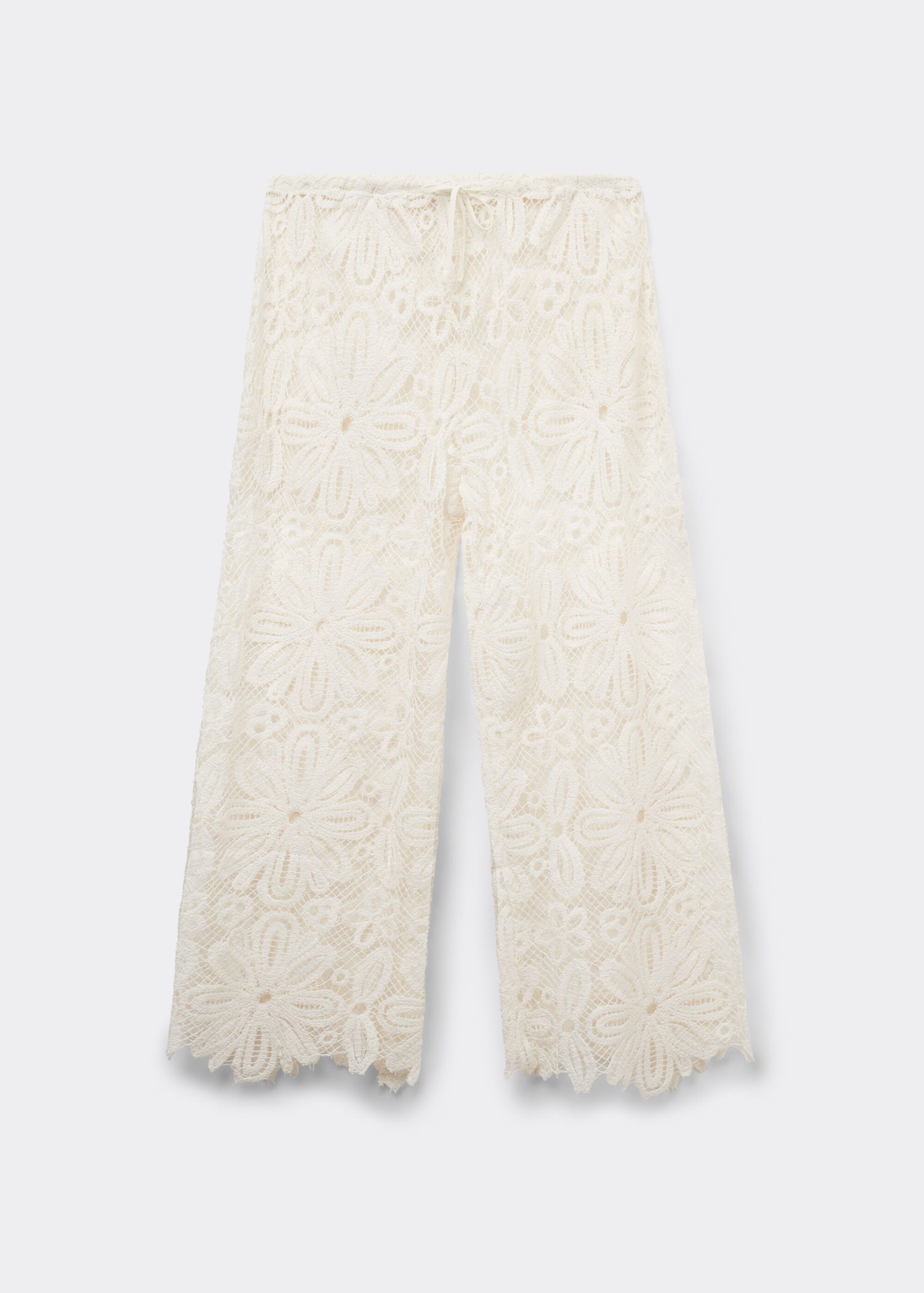 Precious palazzo pants crocheted with a sophisticated floral pattern and with a drawstring at the waist. The supple design elegantly exalts the silhouette, while the unique pattern adds a touch of originality and style. Perfect to wear as a cover-up or as part of a summer outfit paired with the top 0BDA167.
