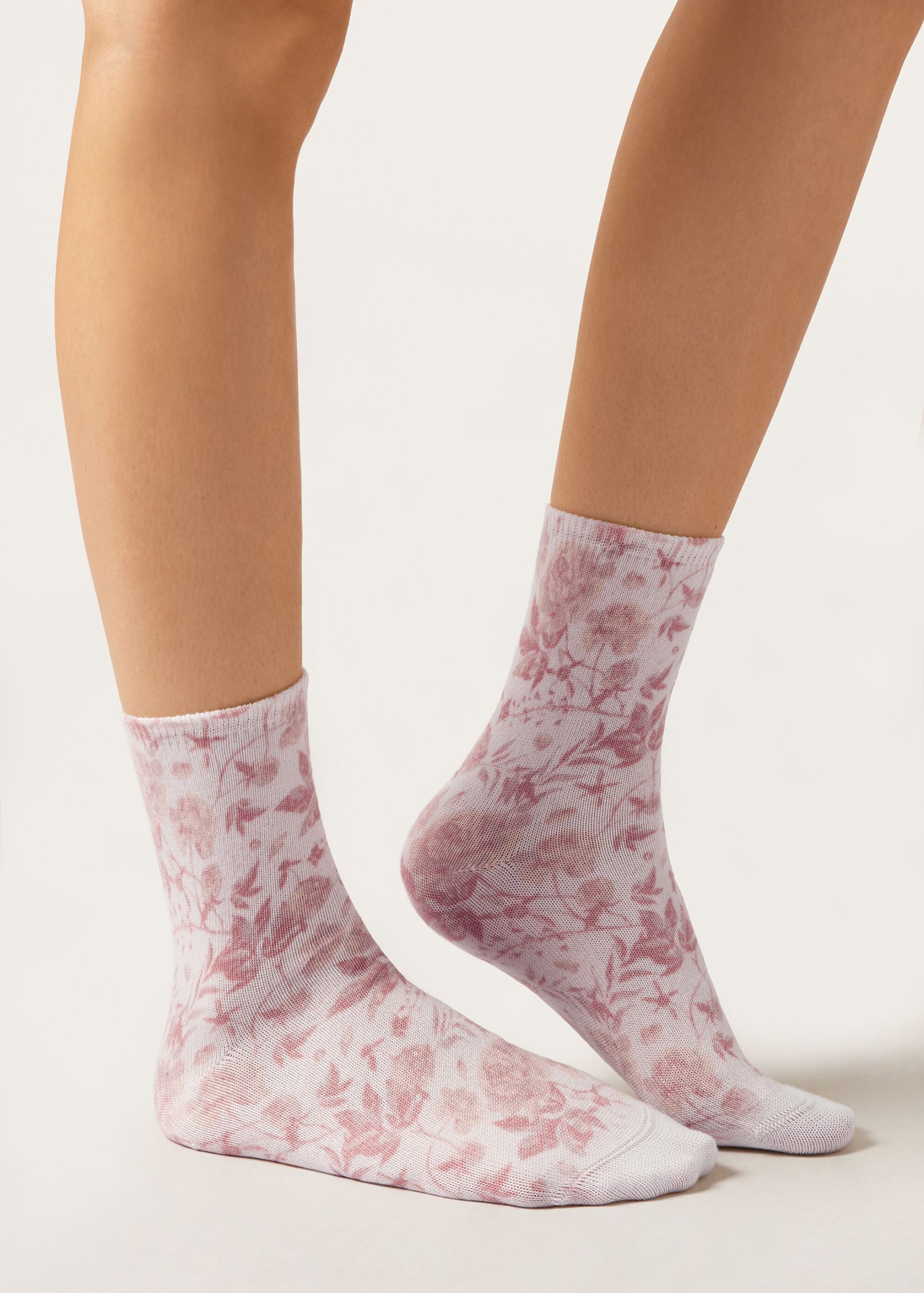 Women’s short socks with a floral digital print in delicate colors for a fresh and feminine look, perfect for a refined and original aesthetic.