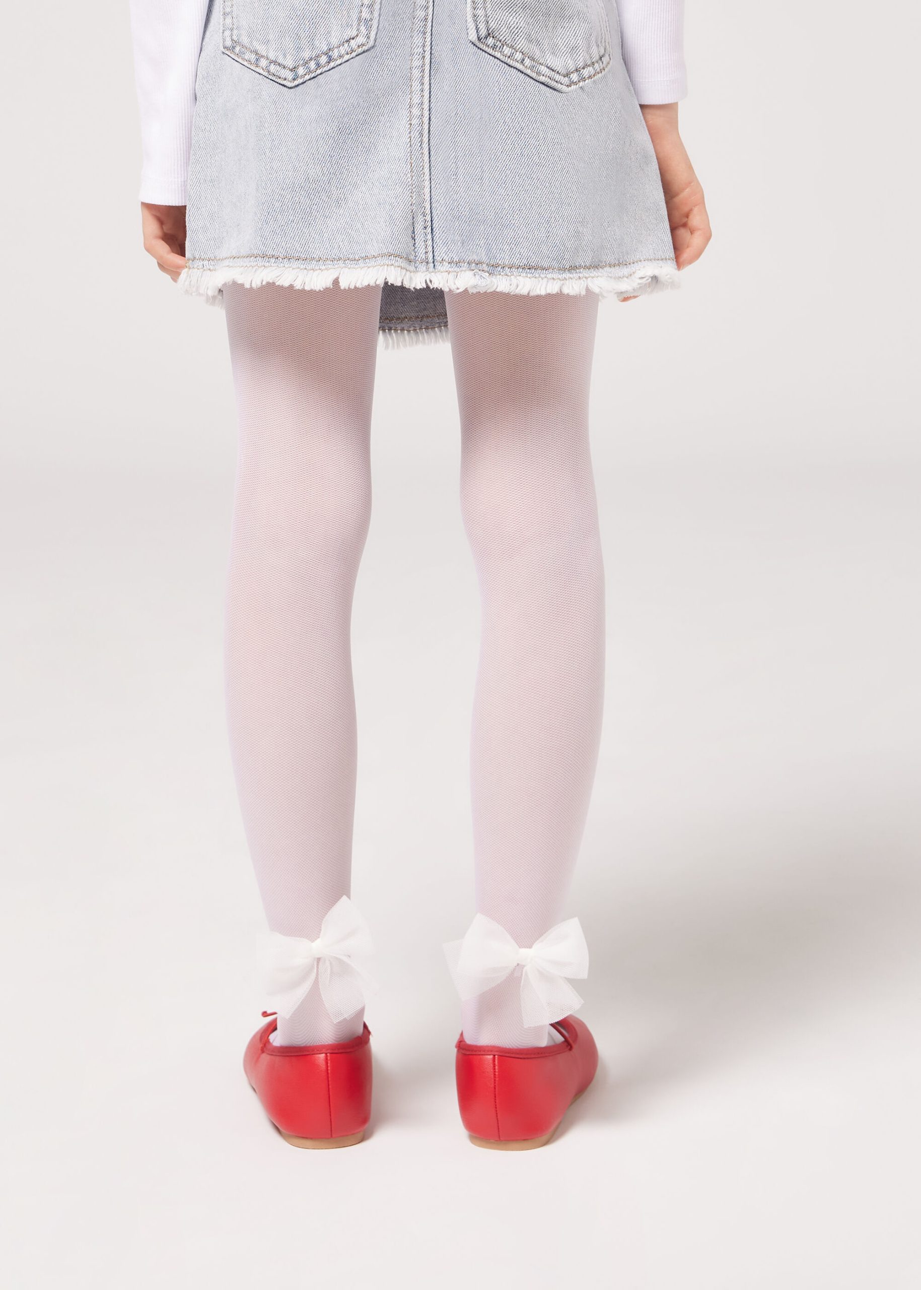 Girls’ 30 denier tulle tights featuring an elegant bow appliqué.