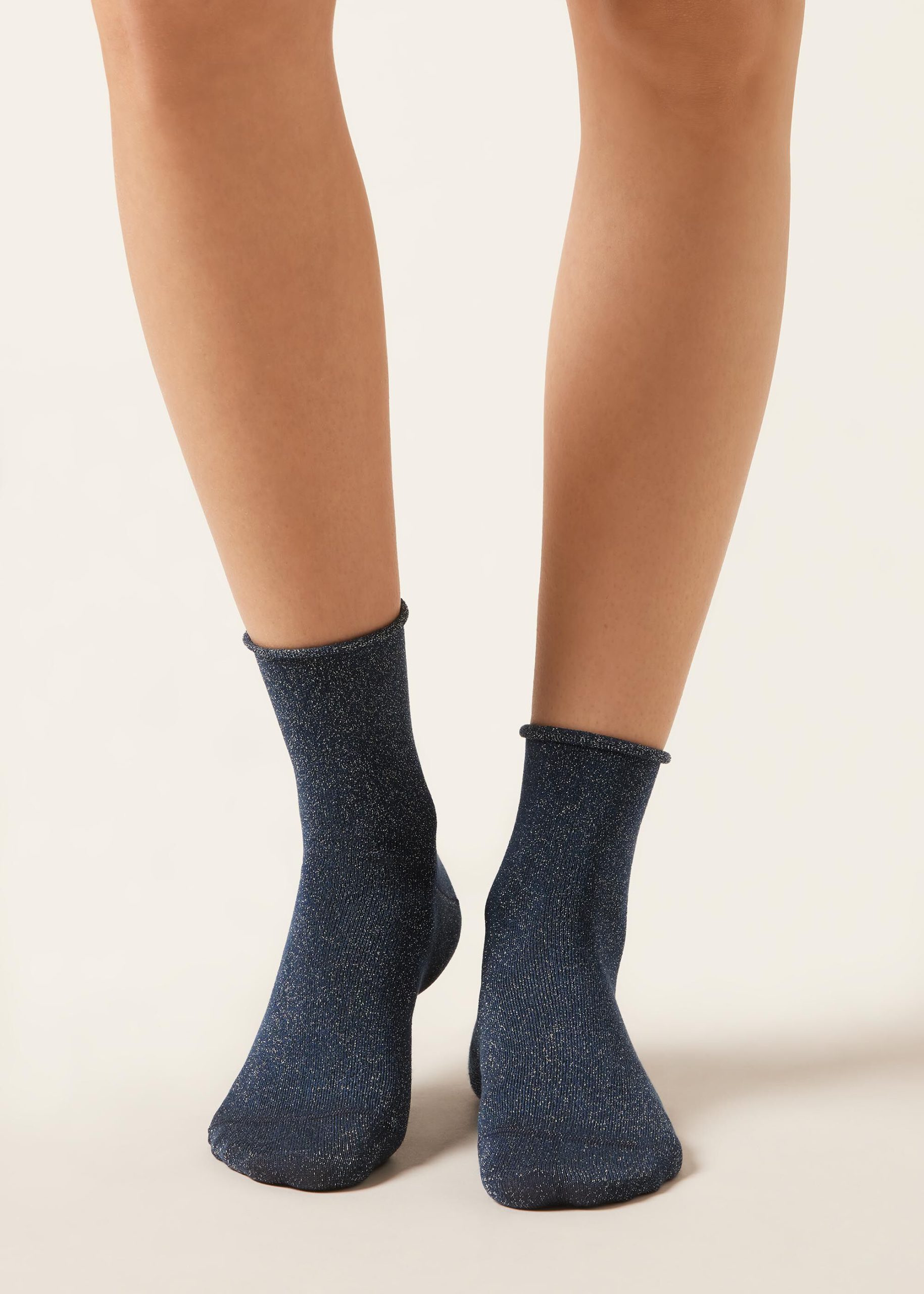 Women’s short socks with glitter trim and comfort edge, for a shiny and cozy touch.