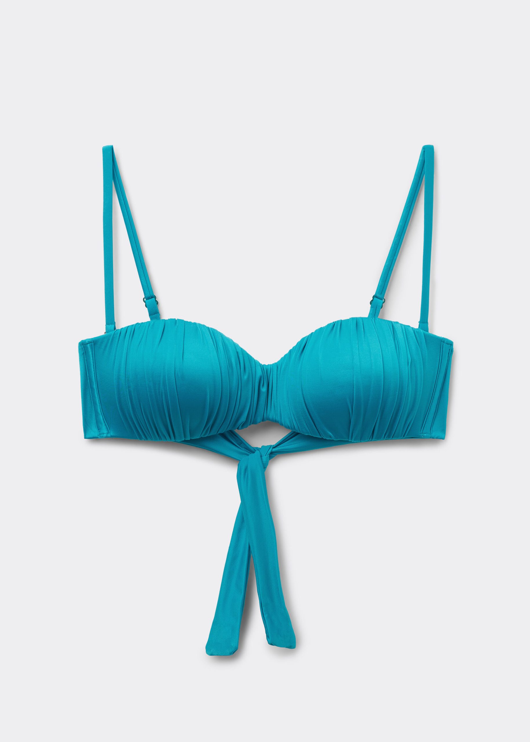 Bandeau bikini top with underwire, graduated padding cups, and side boning to guarantee good support, perfect for those with larger busts. The style features a bright fabric with a silky effect with ruffles. Adjustable and removable straps. Back tie closure.