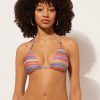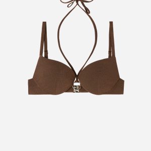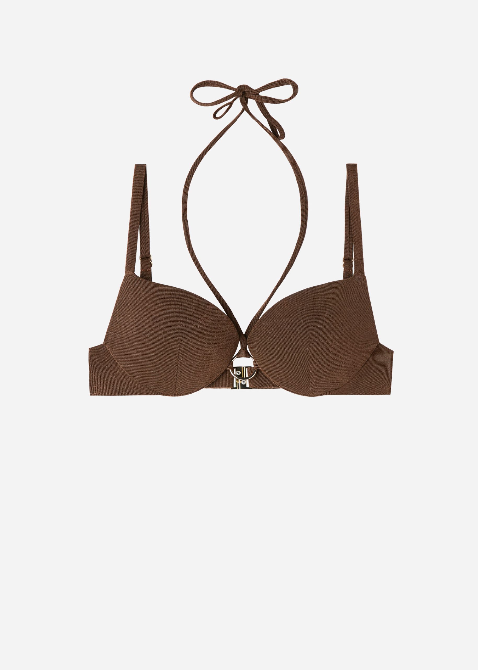 Push-up bikini top with graduated padding and underwire for more volume at the bust. Soft fabric with shiny lamé thread embellished with nickel free small gold rings. Adjustable straps and back hook closure.