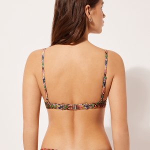 Push-up bikini top with graduated padding and underwire for more volume at the bust. Soft fabric with shiny lamé thread embellished with nickel free small gold rings. Adjustable straps and back hook closure.