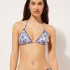 Push-up underwire bikini top with especially soft, graduated padded cups. The style features a bright fabric with a silky effect with ruffles. Adjustable straps and back tie closure.