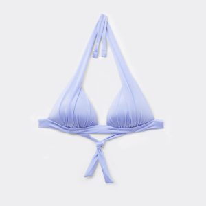 Wireless fixed triangle bikini top with graduated padded cups that add volume to enhance the décolleté. The style features a bright fabric with a silky effect, embellished by ruffles. The shoulder straps have eyelets on the ends so they can be hooked onto the back band or tied behind the neck. Back tie closure.