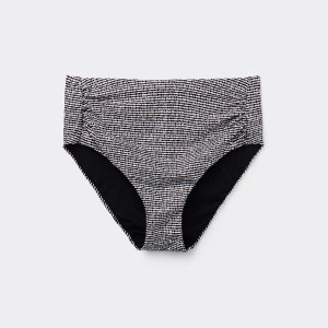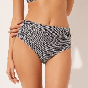 Bikini bottom with a high waist with a shaping effect on the abdomen, guaranteed by a special tulle at the front. The style features a black and white toned pattern embellished with a coated effect. Fully lined with invisible seams.