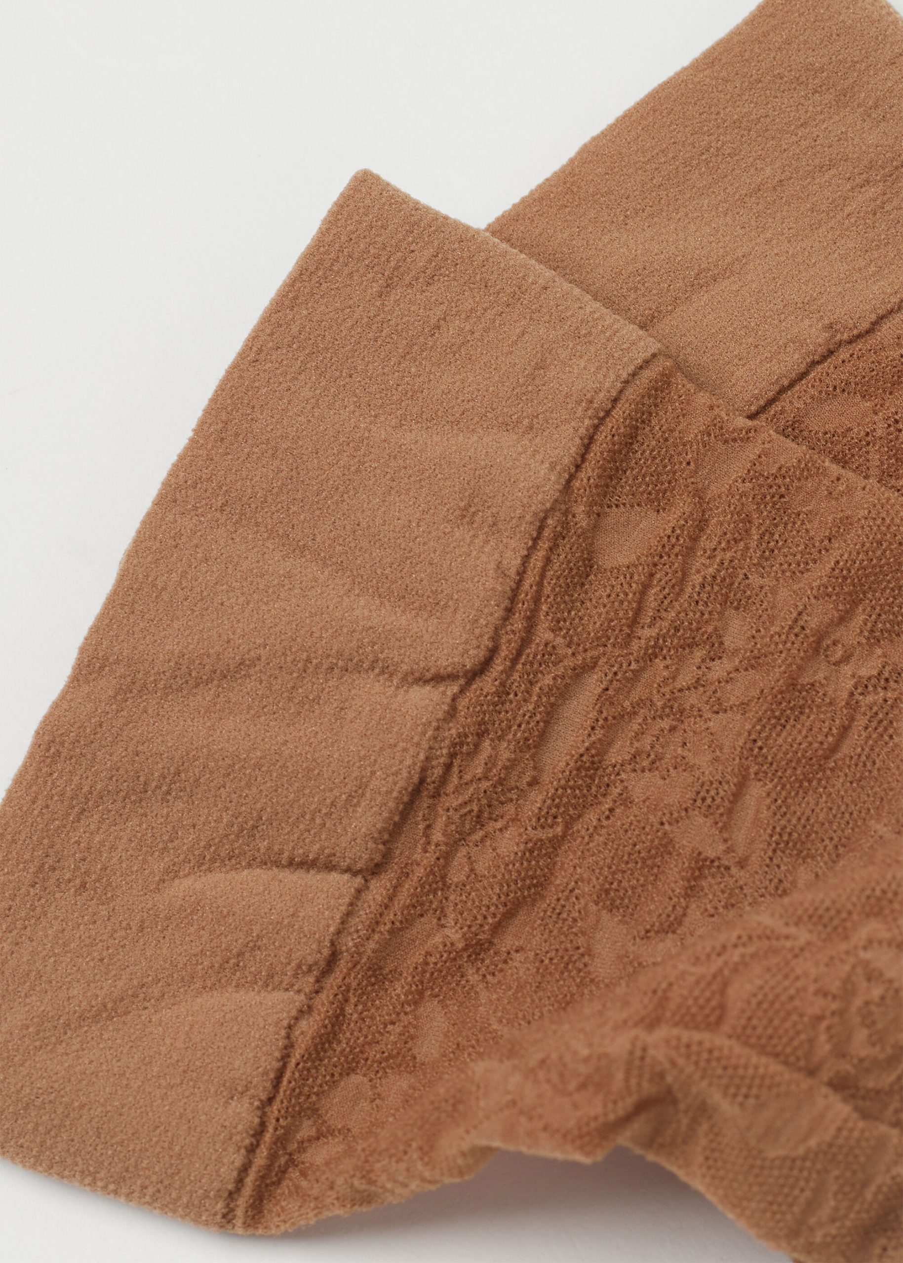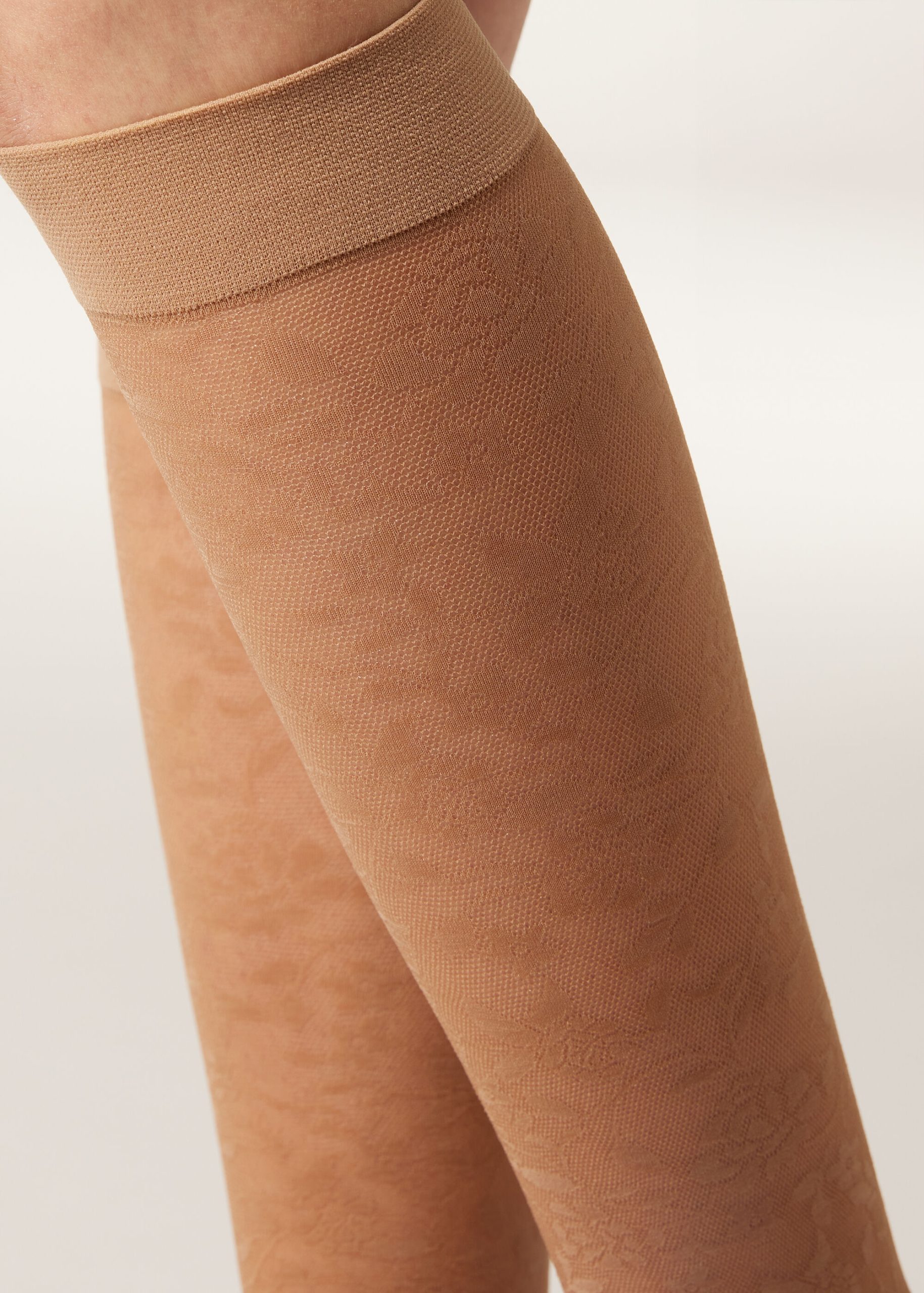 Women’s knee-high socks in tulle 50 denier fabric embellished with a lace floral motif. Smooth cuff.