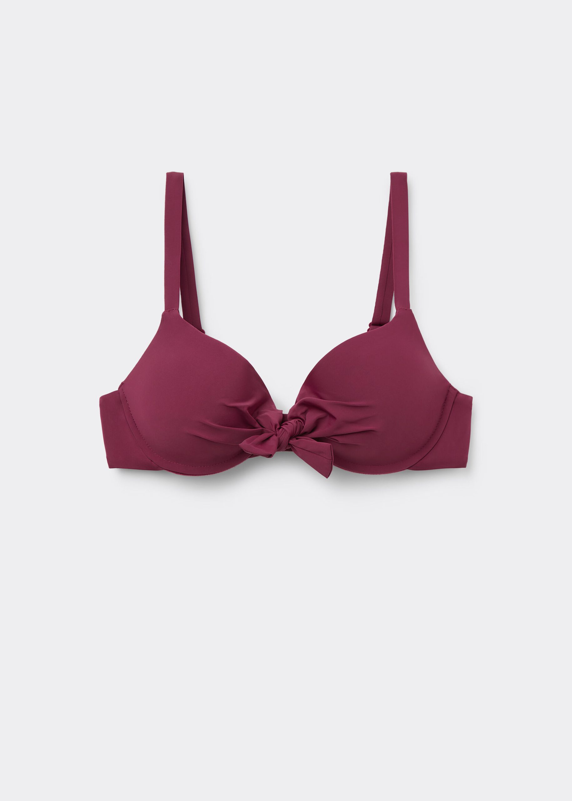 Push-up bikini top with lightly padded cups and underwire to highlight the décolleté. The special bow detail at the décolleté helps to adjust the push-up effect. The extremely soft fabric makes it pleasant to wear, offering a light and comfortable feel on the skin. Adjustable straps. Back closure with two hook-and-eye closures to improve the fit of the underband.