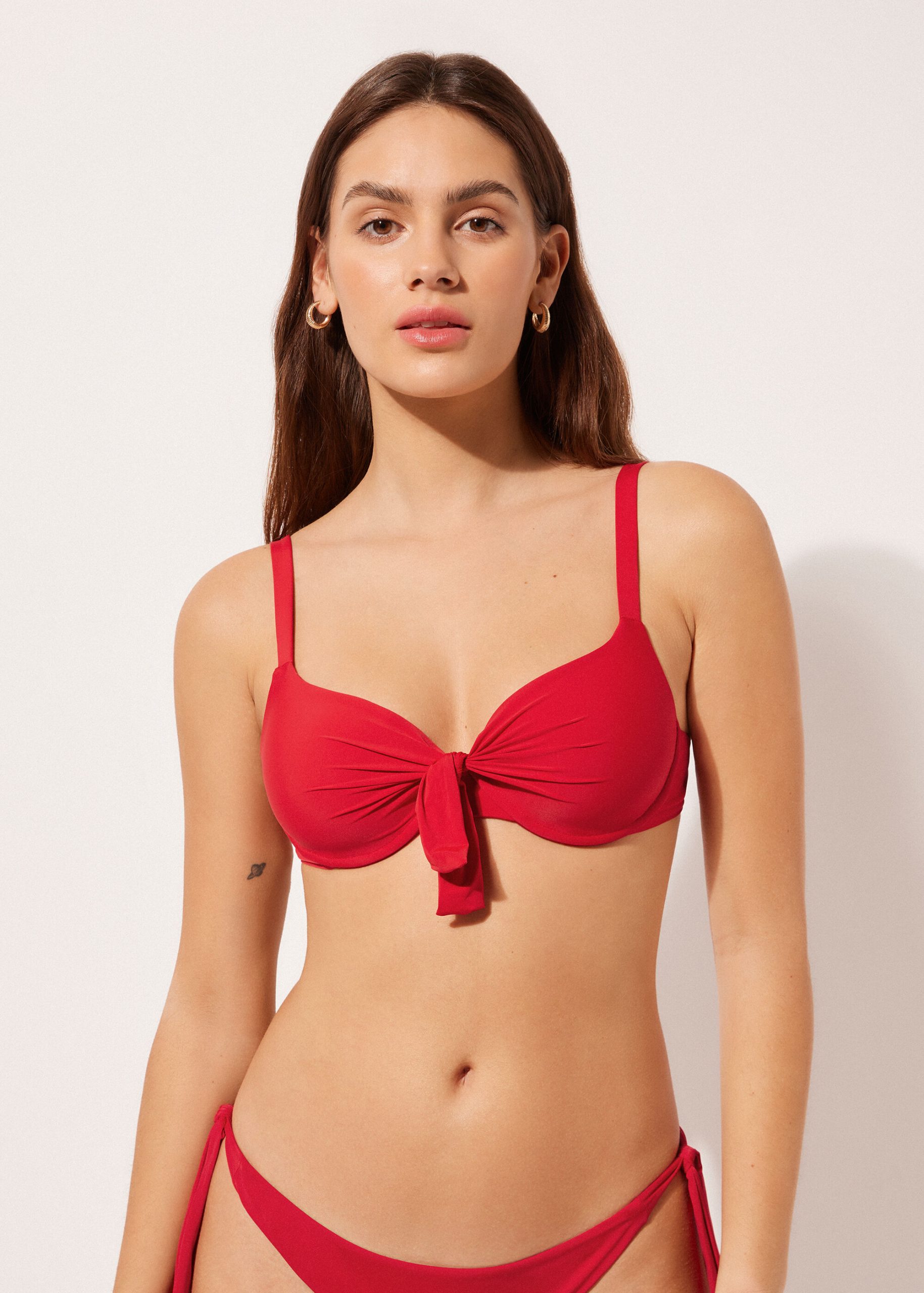 Push-up bikini top with lightly padded cups and underwire to highlight the décolleté. The special bow detail at the décolleté helps to adjust the push-up effect. The extremely soft fabric makes it pleasant to wear, offering a light and comfortable feel on the skin. Adjustable straps. Back closure with two hook-and-eye closures to improve the fit of the underband.