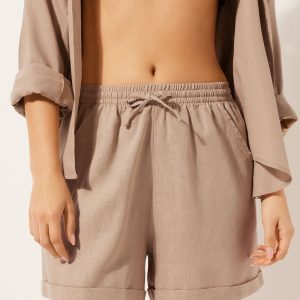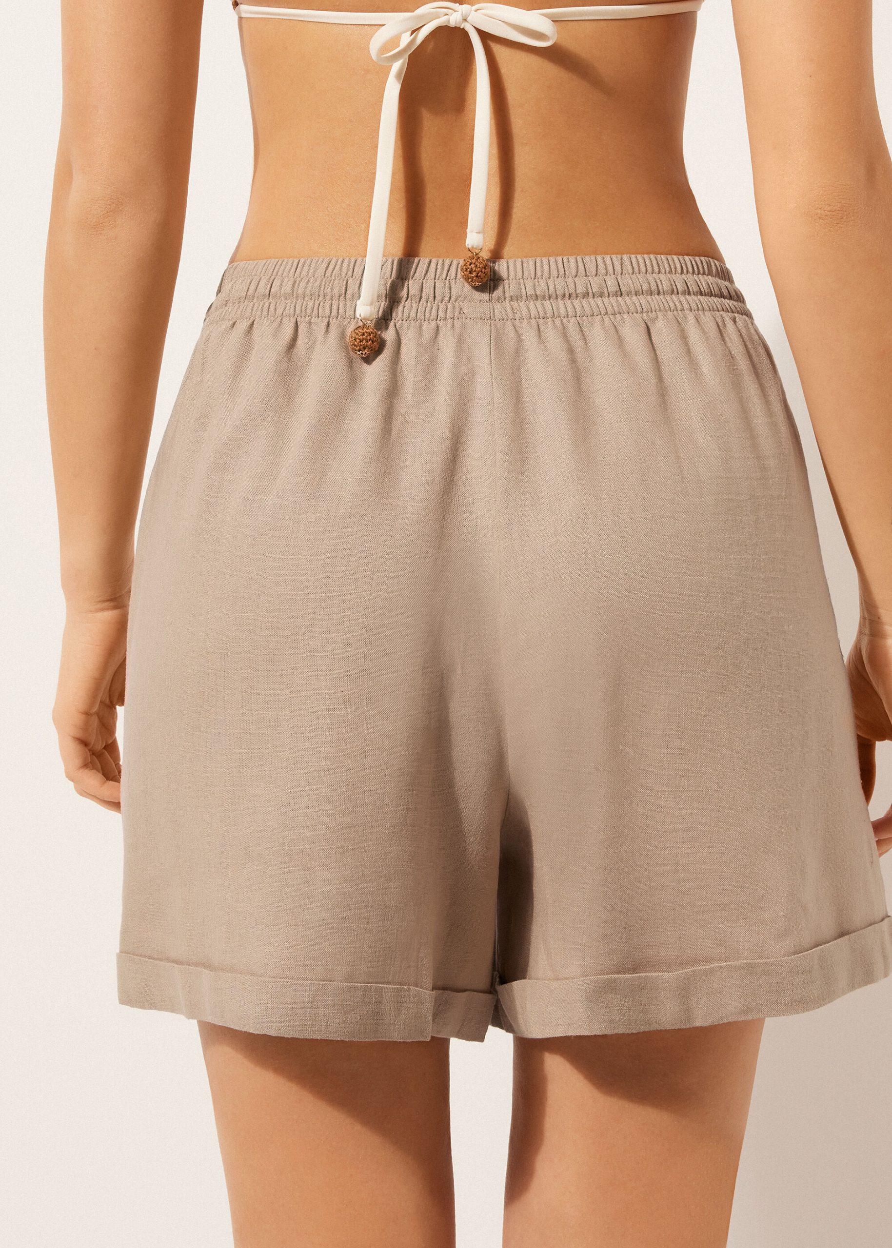 Shorts in a linen and viscose blend with turned up hems, side pockets and a soft elasticated waist with a practical drawstring. Perfect for a cool and smart look for a summer’s day.