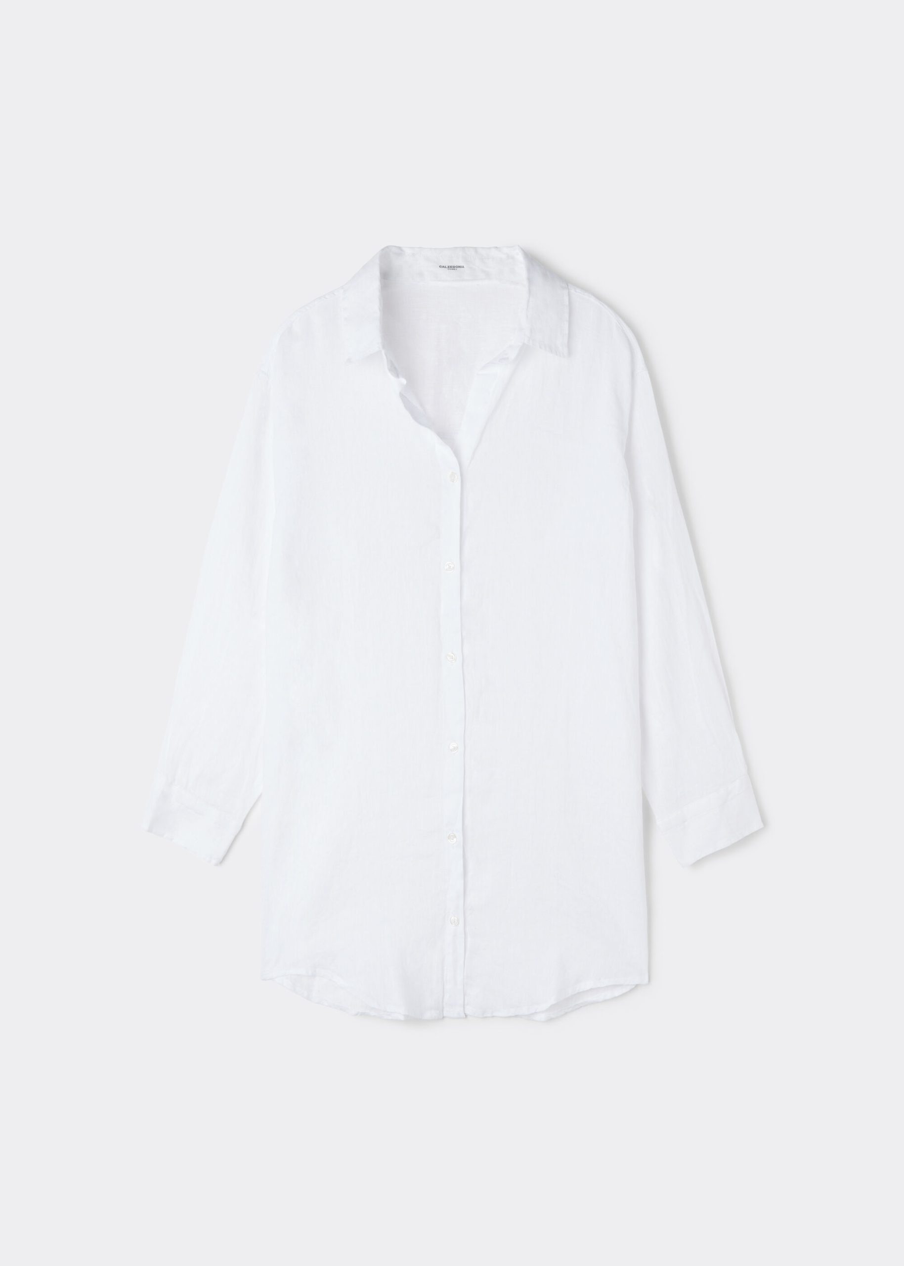 Button up shirtdress in linen for those who love natural fibers, with lapel collar and long sleeves. Above-the-knee length.
