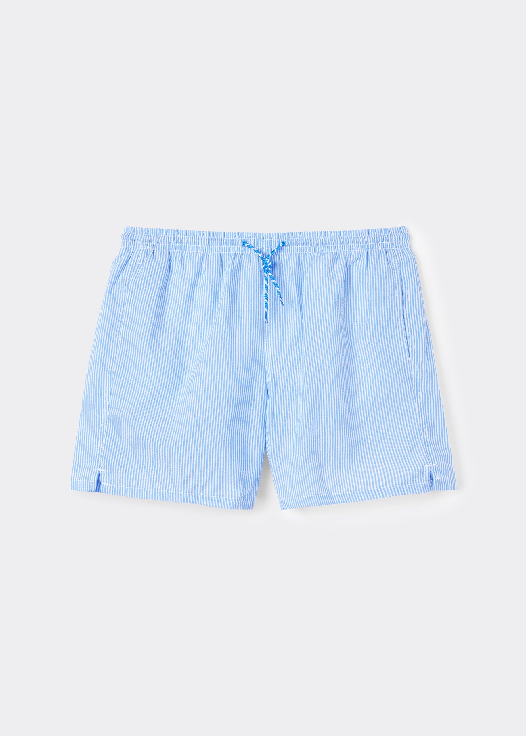 Men’s swim trunks with a gathered covered elastic waistband and two-tone exterior drawstring to adjust the fit. Regular fit with above-the-knee length, side welt pockets, and inner mesh. Back patch pocket with flap and Velcro closure. Yarn dyed cotton feel seersucker fabric, unique for its three-dimensional effect and stripe pattern. Opaque, built-in briefs made from soft fabric. Available in different colors.
