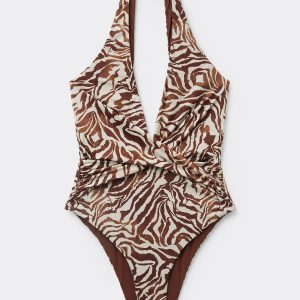One piece swimsuit, wireless and unpadded for a natural effect. The style features a deep front surplice neckline and a sophisticated Brown Zebra print. Fully lined and invisible stitching in order to not mark the figure. Slightly high cut legs with regular back coverage.