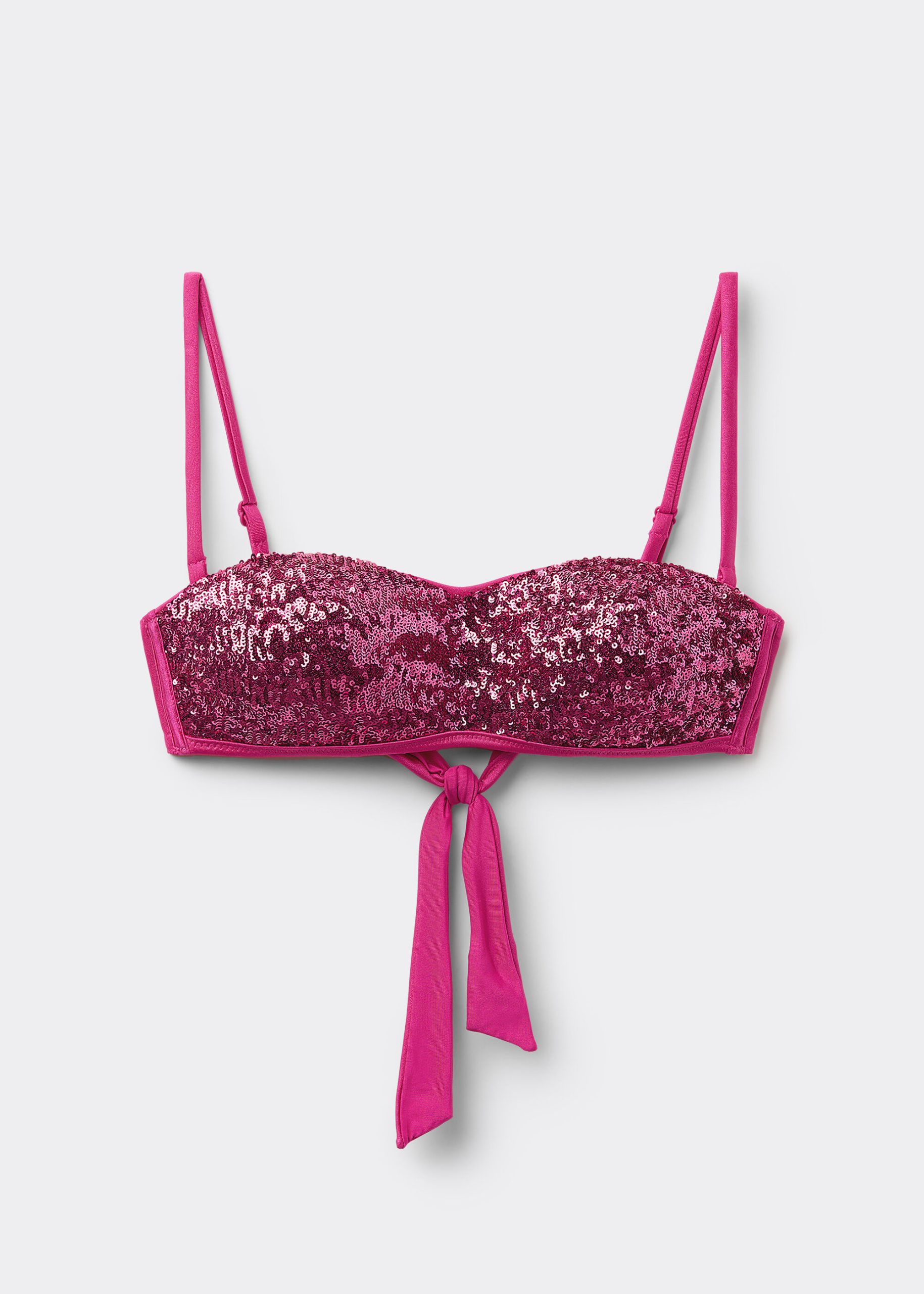 Bandeau bikini top with underwire, graduated padding cups, and side boning to guarantee good support, perfect for those with larger busts. Bright and radiant sequined fabric in bold colors, perfect for a look that grabs attention with its shimmering effect. Adjustable and removable shoulder straps. Back tie closure.