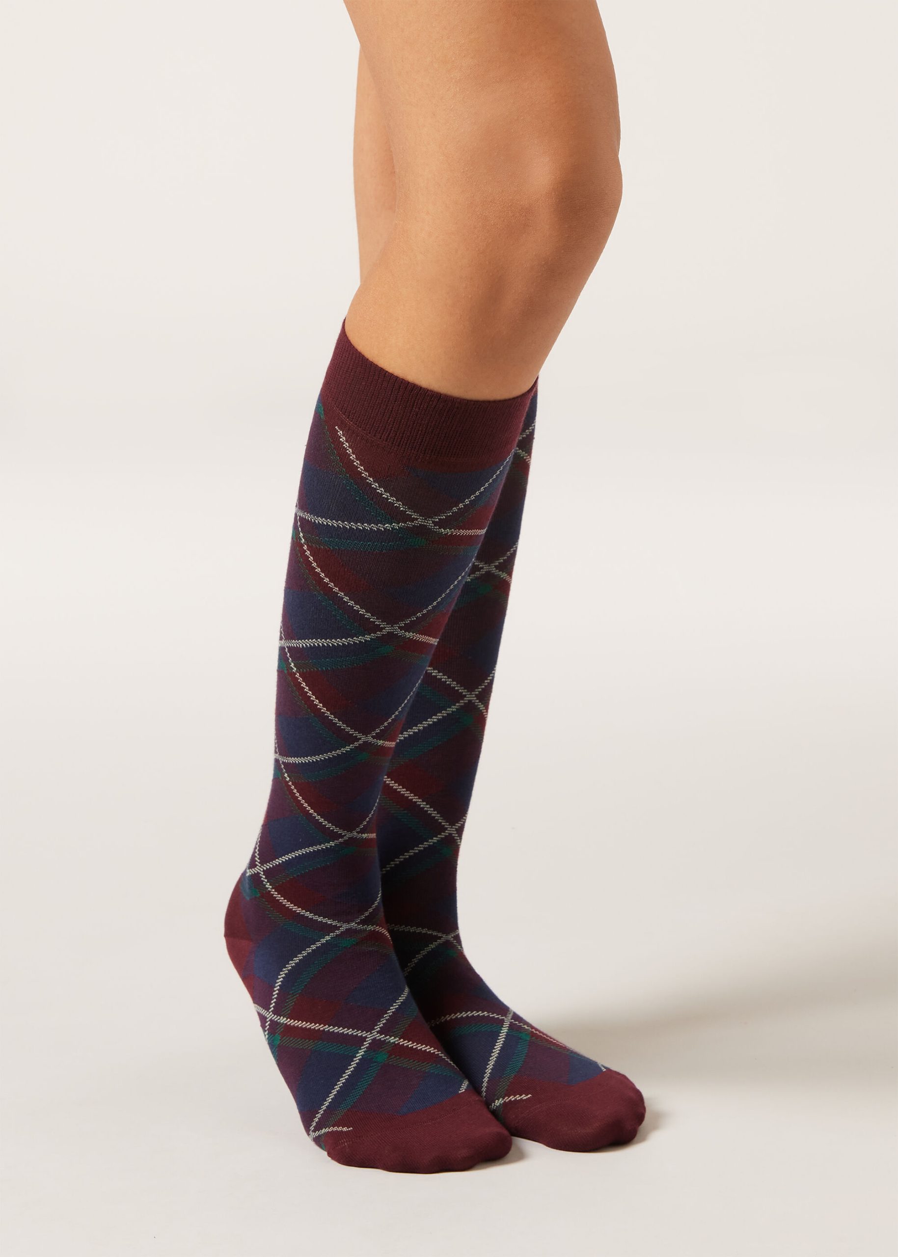 Women’s long cotton socks with elegant foulard pattern. Comfortable and durable, featuring soft elastic for a perfect fit.