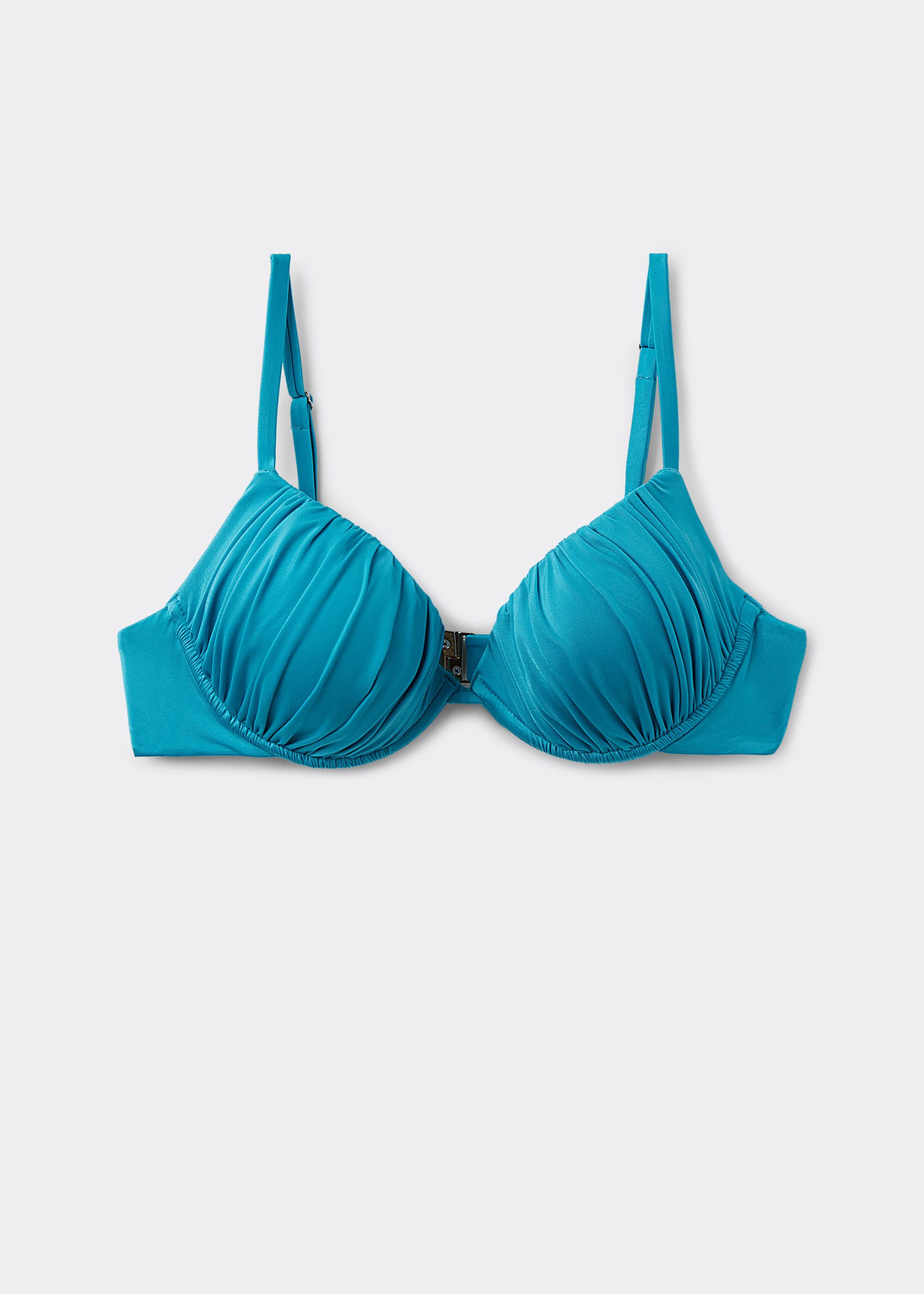 Push-up bikini top with lightly padded cups and underwire to guarantee support and provide volume. The style features a bright fabric with a silky effect. Fixed Shoulder Straps. Rear closure with double adjustment hook.
