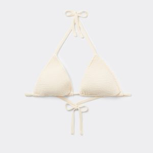 Slide triangle bikini top with removable cups and no underwire for a natural effect. The style features a crinkle fabric with a three-dimensional effect. The shoulder straps have eyelets on the ends so they can be hooked onto the back band or tied behind the neck. Back string tie closure.
