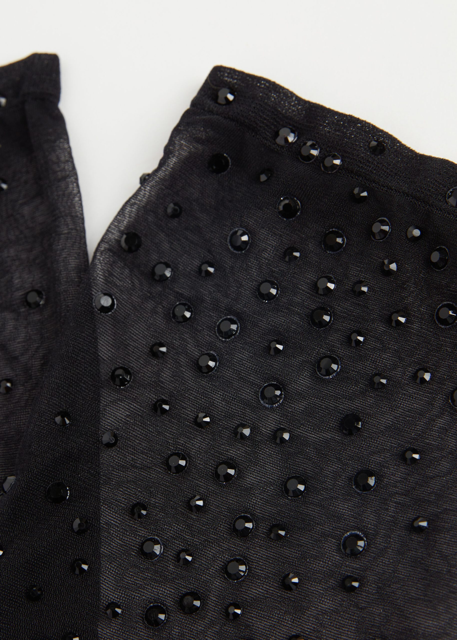 Women’s sheer 10 denier short socks featuring shiny tone-on-tone rhinestone appliqués. Comfortable smooth cuff.