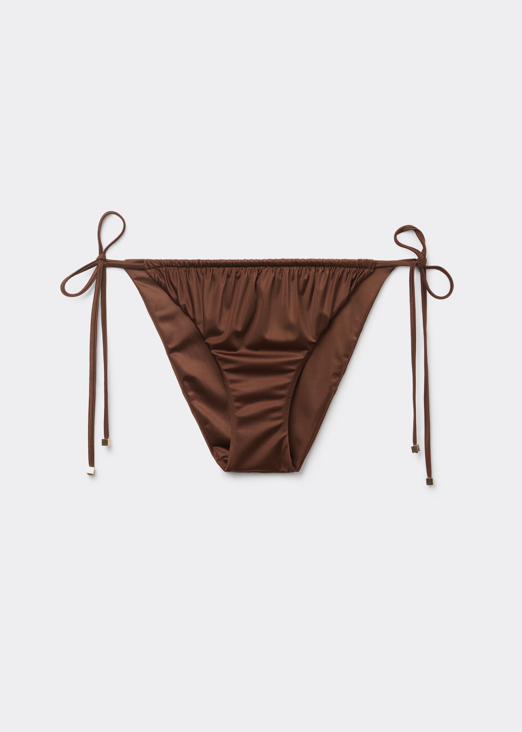 Bikini bottom with side ties to adjust the fit. The style features a bright fabric with a silky effect, embellished by ruffles and gold tips. Fully lined with invisible seams.