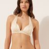 Thong bikini bottoms with side string ties to adjust the fit. It features a minimal fit that exalts the silhouette with a touch of sensuality and refinement. The slightly rounded waist at the front allows for both a regular and more high-cut fit, depending on one’s physique. The bright silk-effect fabric embellished by elegant golden details radiates a sophisticated sensation of discrete luxury. Fully lined with invisible seams.