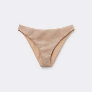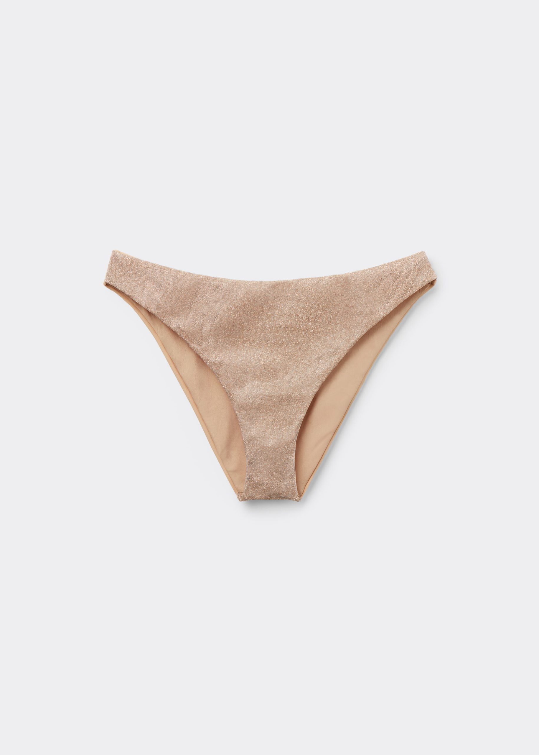 Fully lined bikini bottoms with invisible seams in order to not leave marks. The rounded waist at the front allows for both a classic or more high-cut fit, depending on one’s physique. The bright glittery fabric stands out with its sophisticated shine, perfect for a glamorous look.