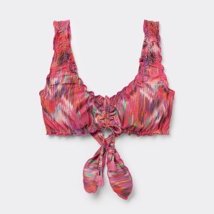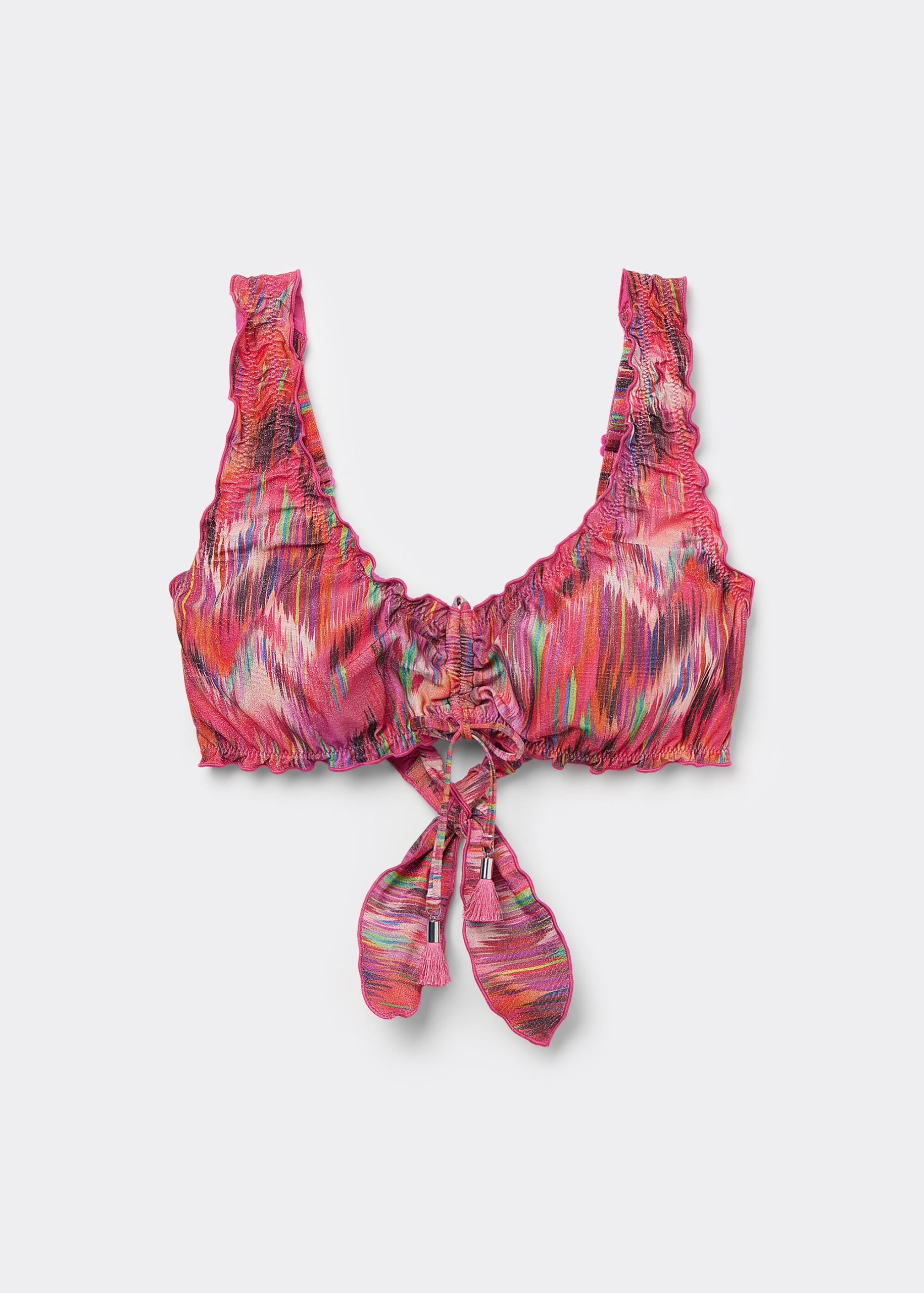 Tank-style bikini top with underwire and cups with removable padding. Adjustable shoulder straps. Back tie closure. Pattern illuminated by sparkling glitter, with vibrant patterns in a mix of warm and bright tones. Reminiscent of a refined ethnic style, perfect for a unique summer look that is full of energy. Back tie closure.
