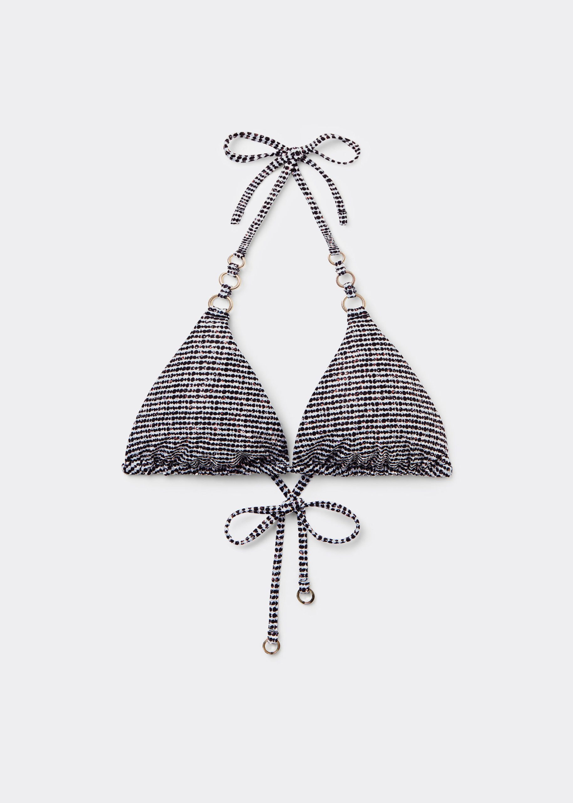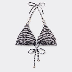 Slide triangle bikini top with removable padding, wireless for a natural effect. The style features a black and white toned pattern embellished with a coated effect. The shoulder straps have eyelets on the ends so they can be hooked onto the back band or tied behind the neck. Back string tie closure.