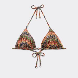 Slide triangle bikini top with removable padding, wireless for a natural effect. The multicolored pattern, featuring a wave motif and a bold mix of bright colors, has a dynamic effect ideal for the summer. The shoulder straps have eyelets on the ends so they can be hooked onto the back band or tied behind the neck. Back string tie closure.