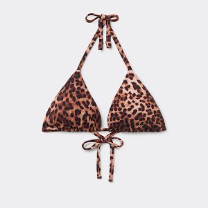 Slide triangle bikini top with removable padding, wireless for a natural effect. The style features an elegant animal pattern and lightly ruched fabric. The shoulder straps have eyelets on the ends so they can be hooked onto the back band or tied behind the neck. Back string tie closure.