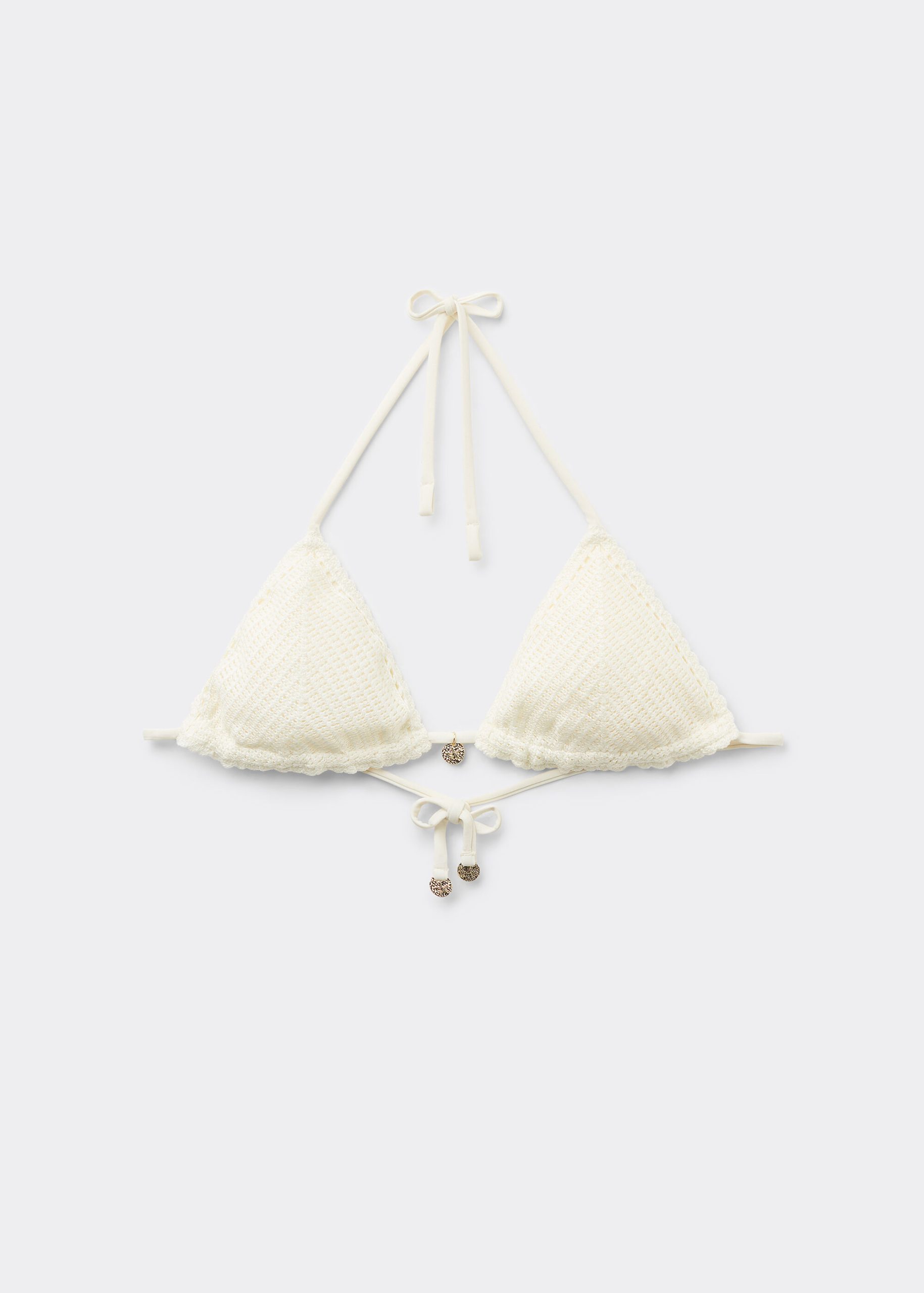 Slide triangle bikini top with removable padding, wireless for a natural effect. The refined and sophisticated crochet fabric is enriched by a small medal on the center front gore that exalts its elegance. The shoulder straps have eyelets on the ends so they can be hooked onto the back band or tied behind the neck. Back string tie closure.